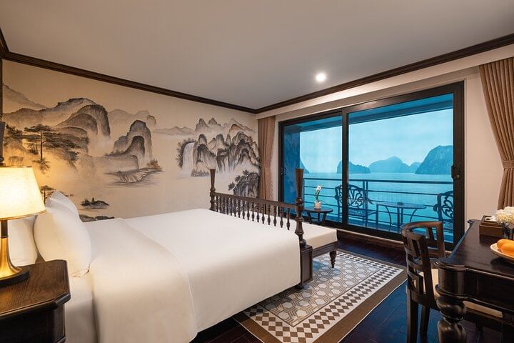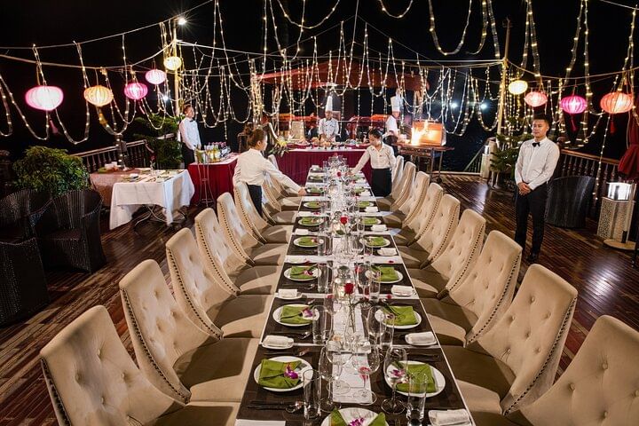 This 5-star yacht is equipped with world-class amenities, including a fine-dining restaurant with panoramic views, an outdoor bar, a seasonal swimming pool, a gym, a spa and massage center, and a children's playground. Our attention to detail and dedication to meeting your every need distinguish us, ensuring that your Halong Bay journey is both extraordinary and memorable. Join us for an enchanting experience you won’t forget.