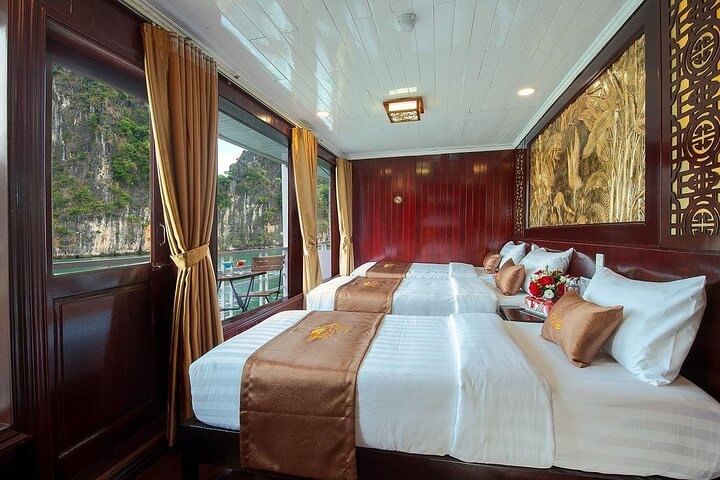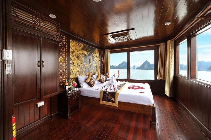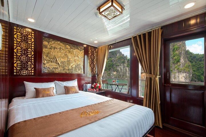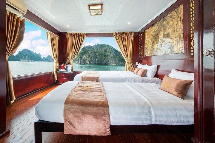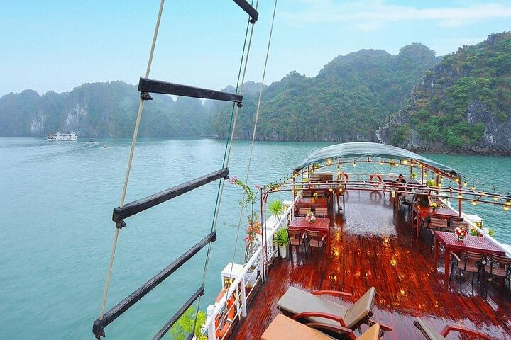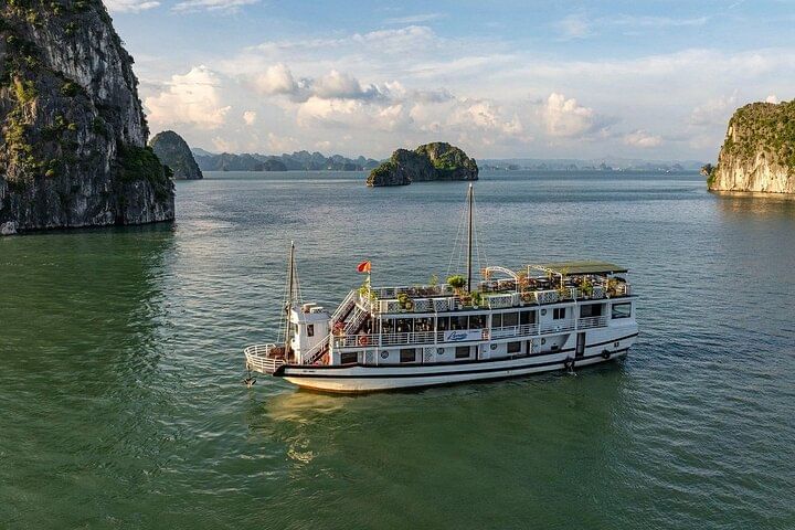 Experience the perfect blend of culture, nature, and luxury on this scenic cruise from Hanoi. Sail aboard a beautifully crafted boat featuring Indochina-style architecture and traditional Vietnamese décor. Venture into the hidden paradise of Bai Tu Long Bay—equally magnificent as Ha Long Bay but far more peaceful. Capture mesmerizing photos of untouched landscapes and enjoy onboard activities such as a sunset party, squid fishing, and a fun cooking class. Savor freshly prepared meals with breathtaking bay views, unwind or kayak at Cap La Island, and spend the night in a comfortable cabin with panoramic windows—perfect for admiring both sunset and sunrise over the bay.